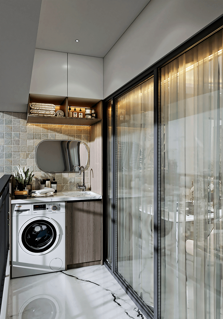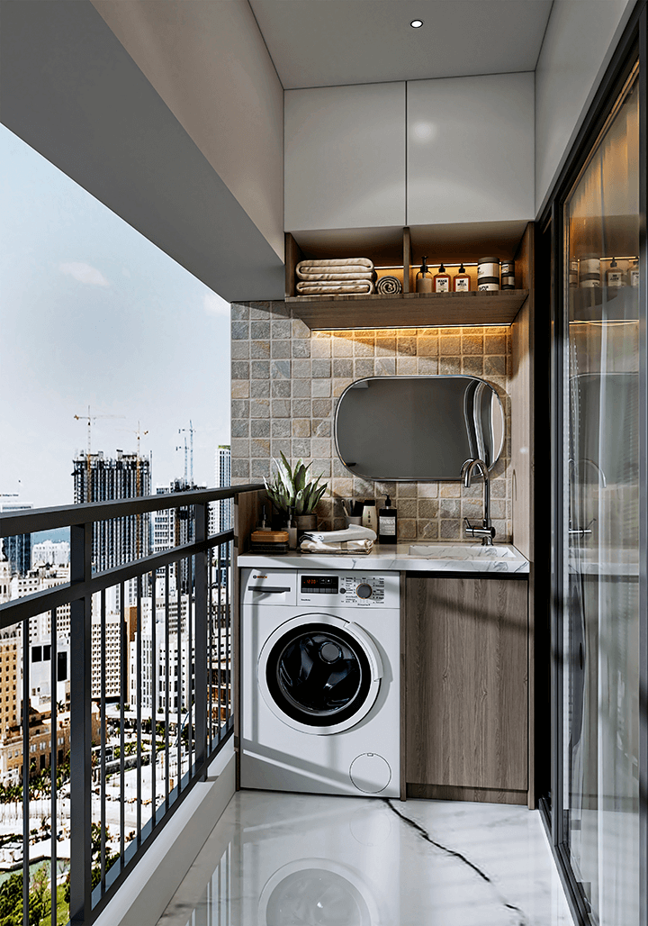 A smartly designed utility balcony integrates the washing machine, storage cabinets, and wash basin without compromising aesthetics—making everyday chores efficient and organized.