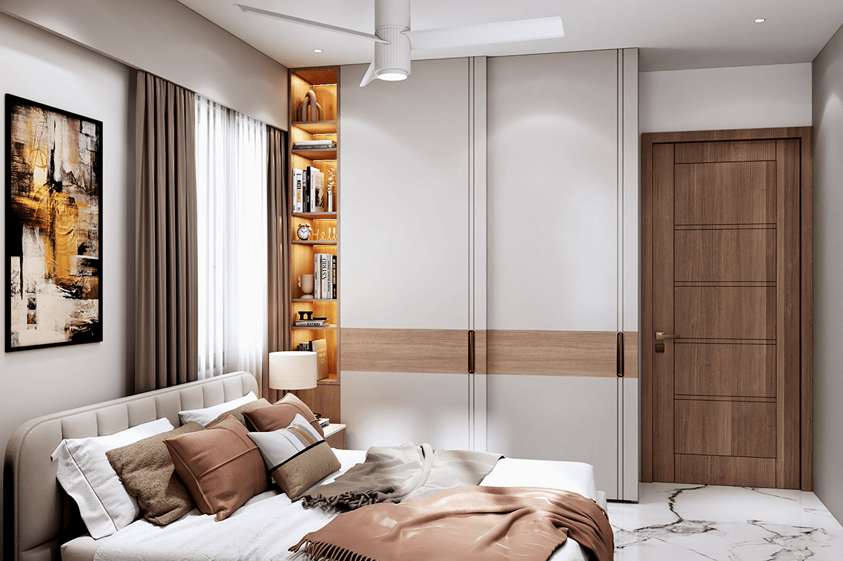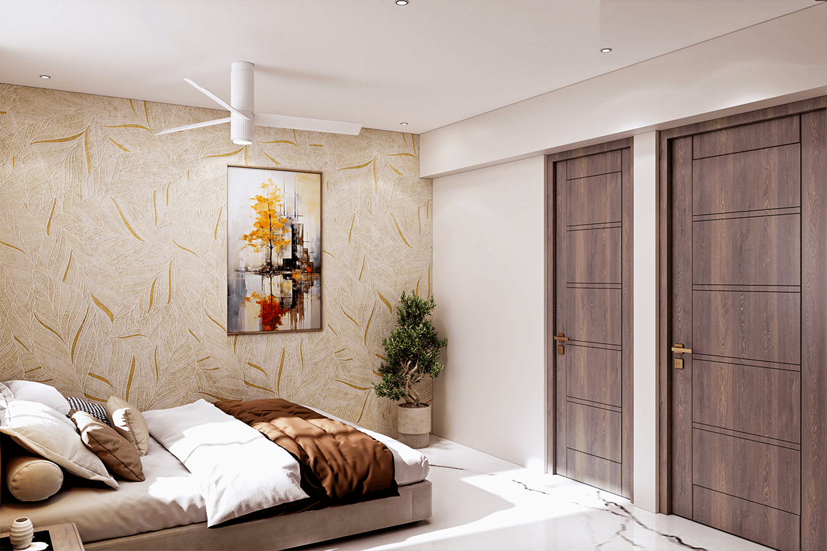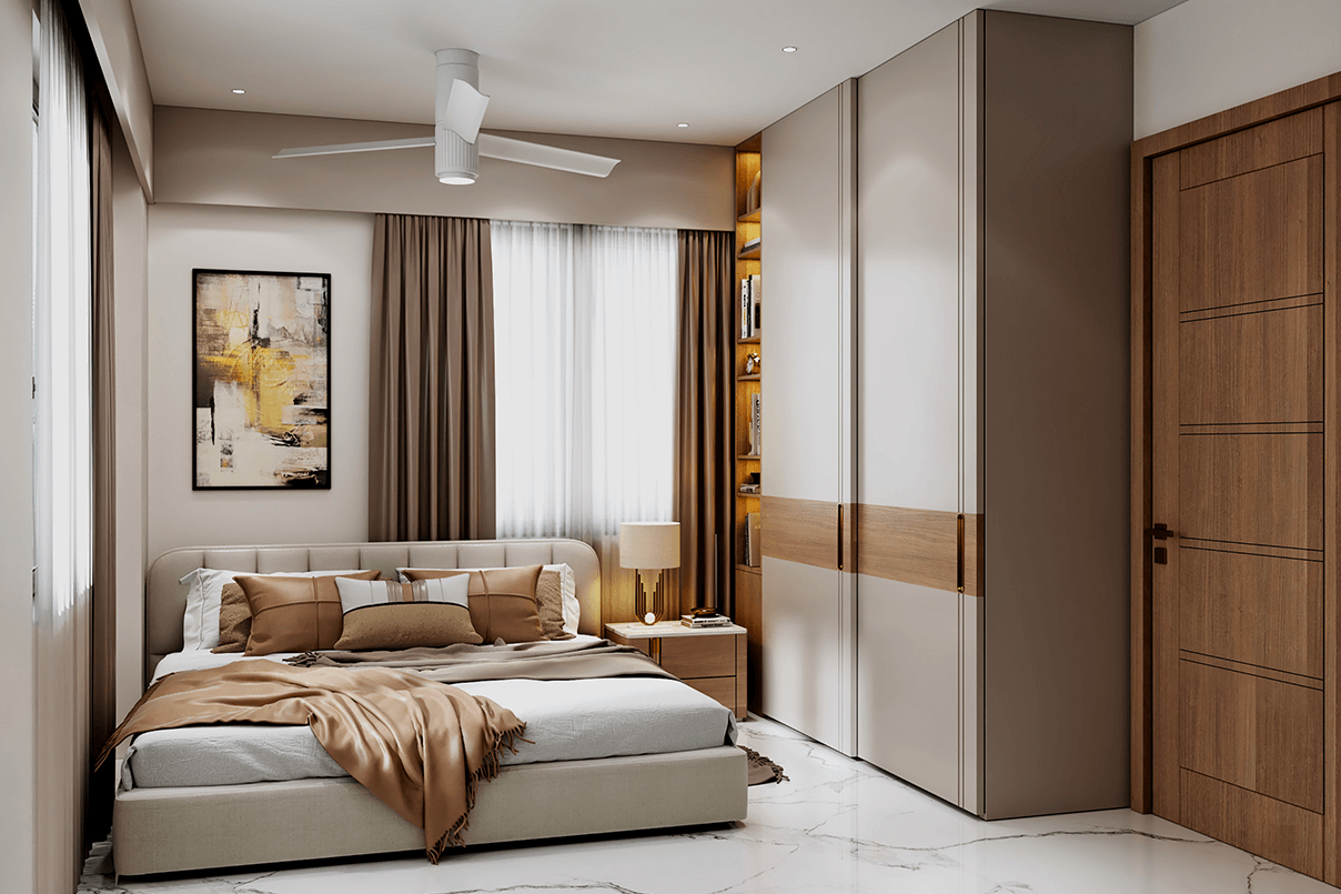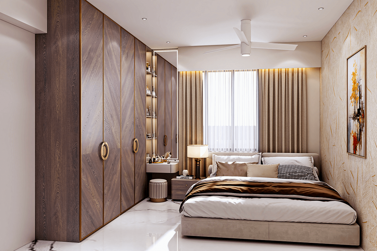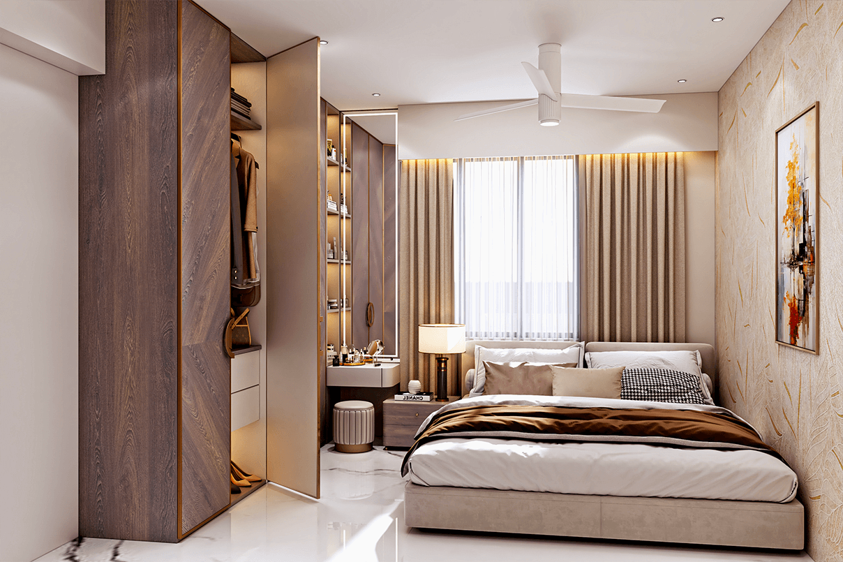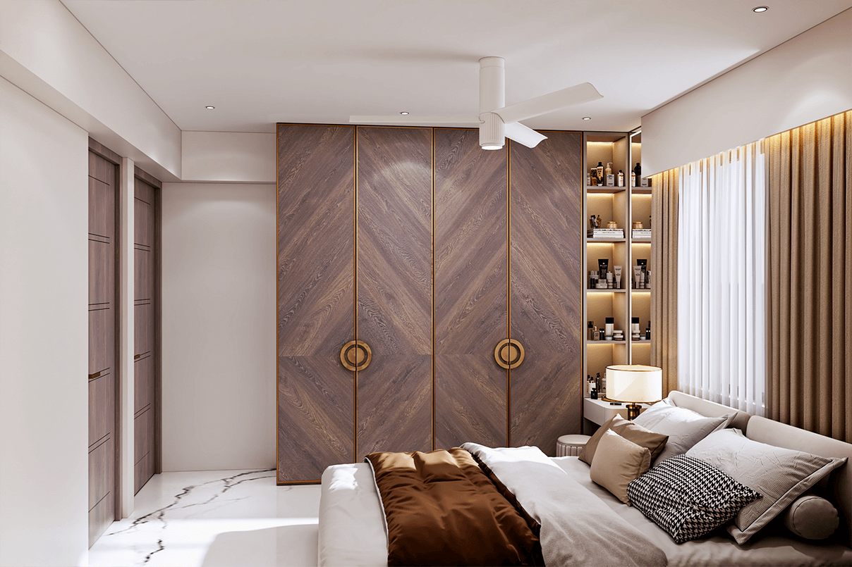 Master Bedroom: Custom wardrobes with textured finishes and brass accents add a touch of luxury. Soft lighting, neutral upholstery, and clean lines create a serene retreat.