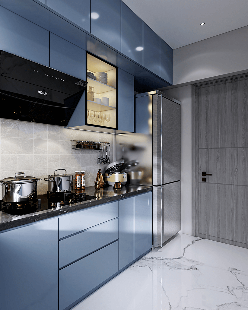 The kitchen showcases sleek modular cabinetry with a matte finish, paired with durable countertops and efficient storage. Thoughtful planning ensures maximum usability while maintaining a clean and modern look.