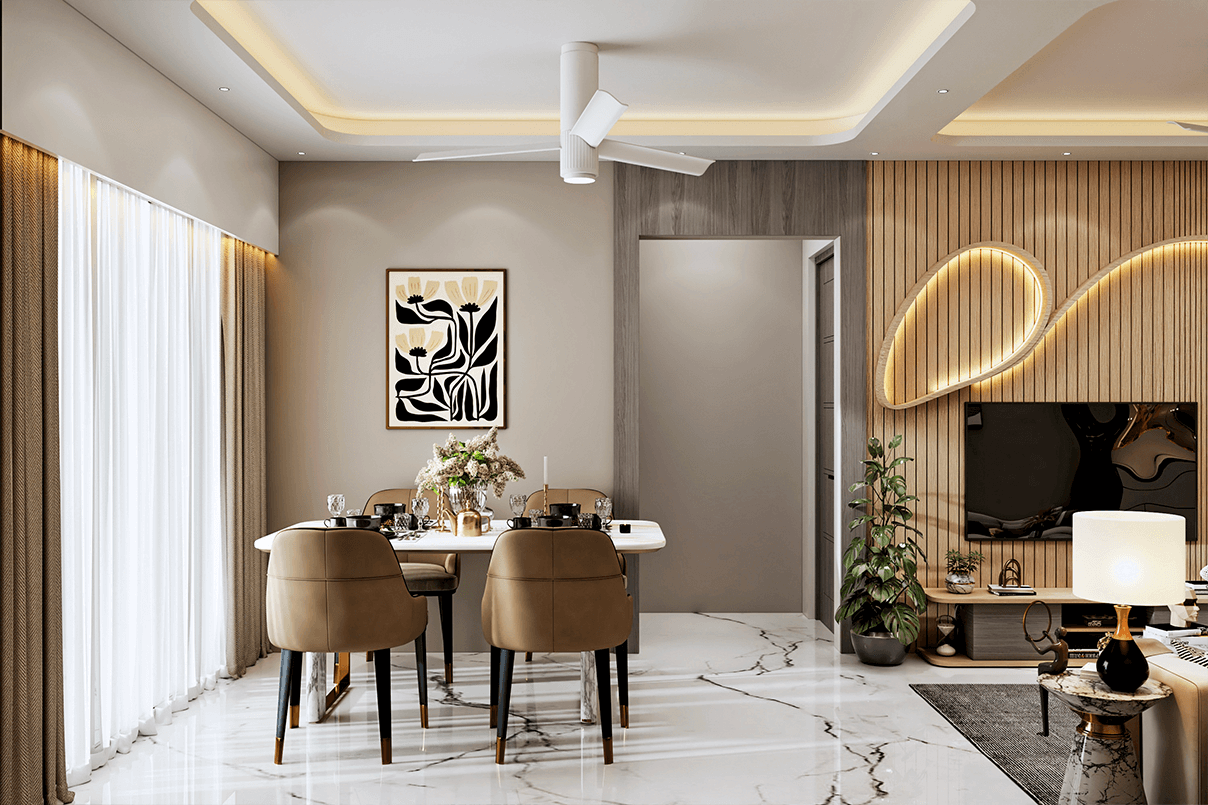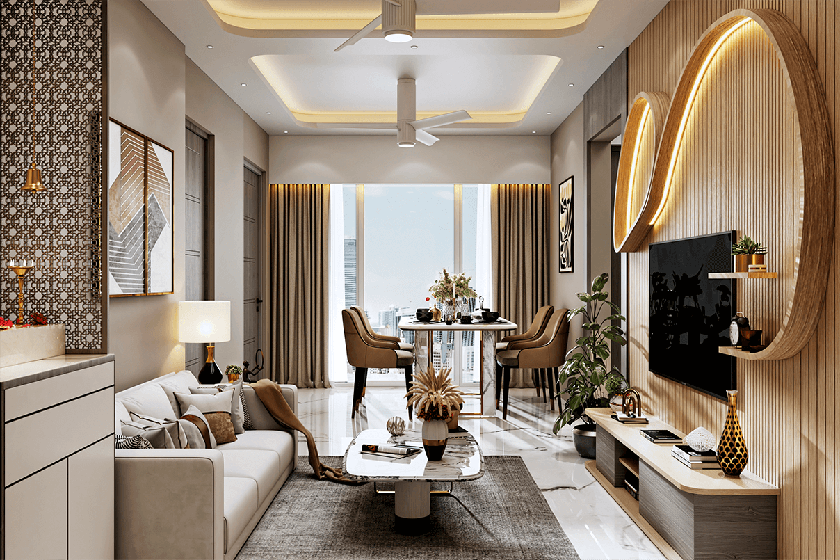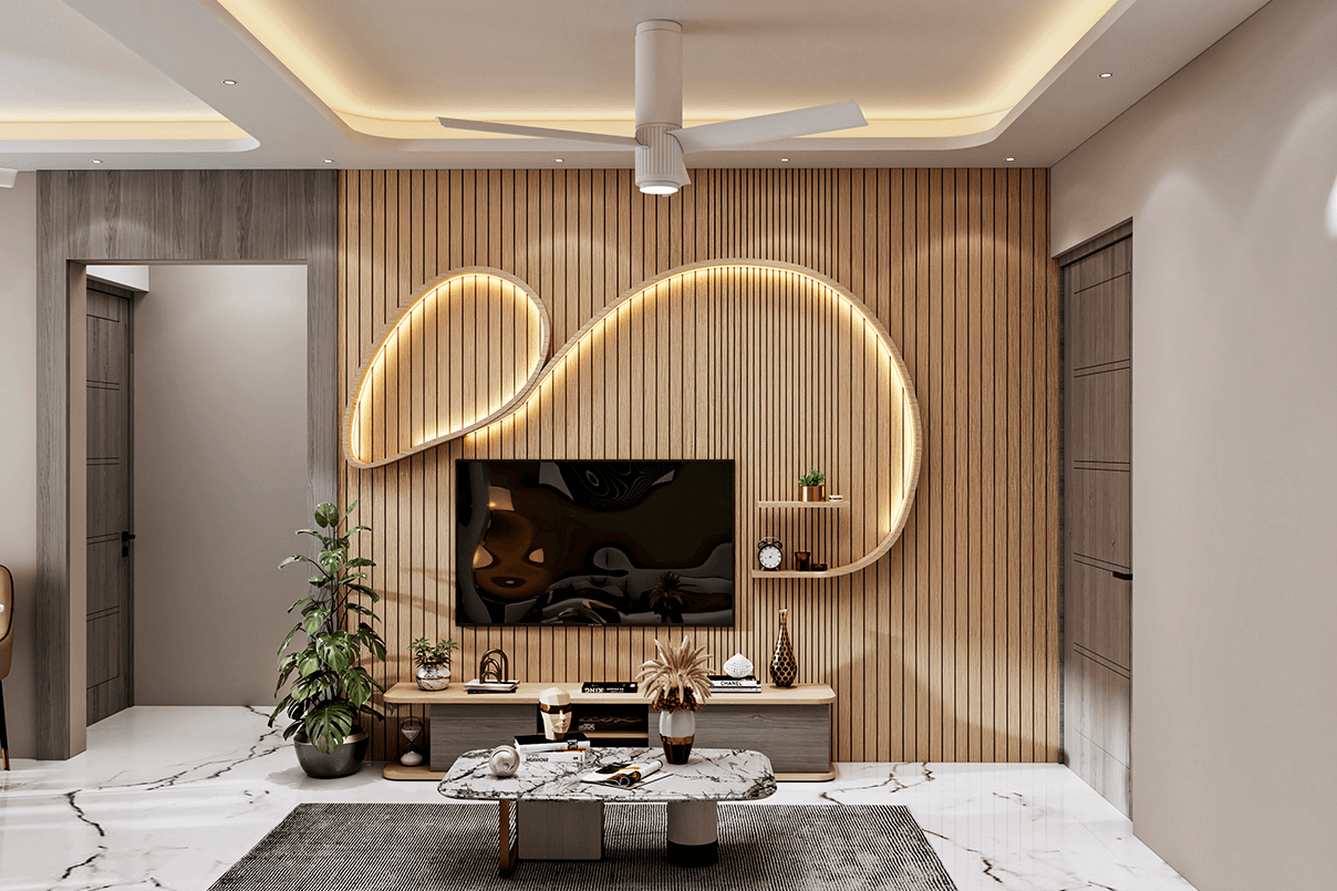 The living area features a statement wooden slat TV wall with integrated LED lighting, creating a strong focal point without overpowering the space. A compact yet stylish seating arrangement, marble-finish center table, and subtle décor elements add elegance.