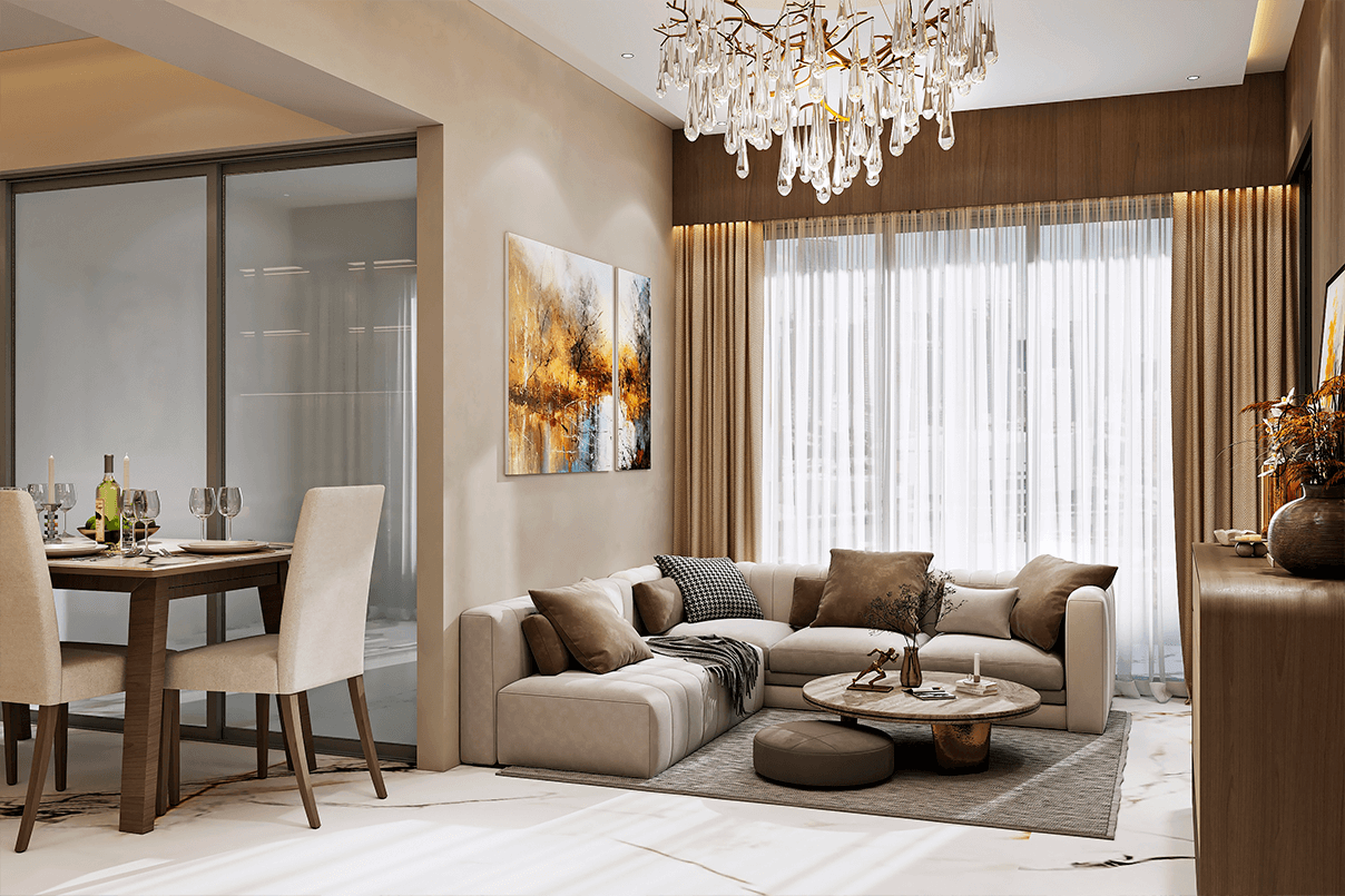 The design concept centers around minimal sophistication with warm undertones. A neutral palette enriched with textured surfaces, soft lighting, and clean architectural lines ensures the home feels spacious, calm, and timeless.