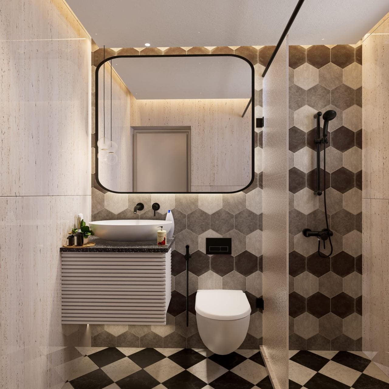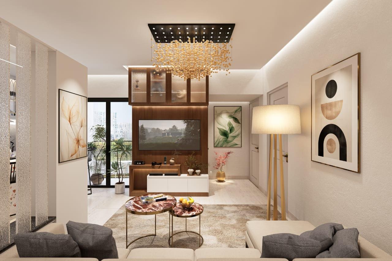 The living space is highlighted by a sleek TV unit with vertical panel detailing and ambient LED lighting, giving the room a sophisticated focal point. Display cabinets with soft backlighting enhance depth and visual interest, while neutral tones keep the space calm and welcoming.