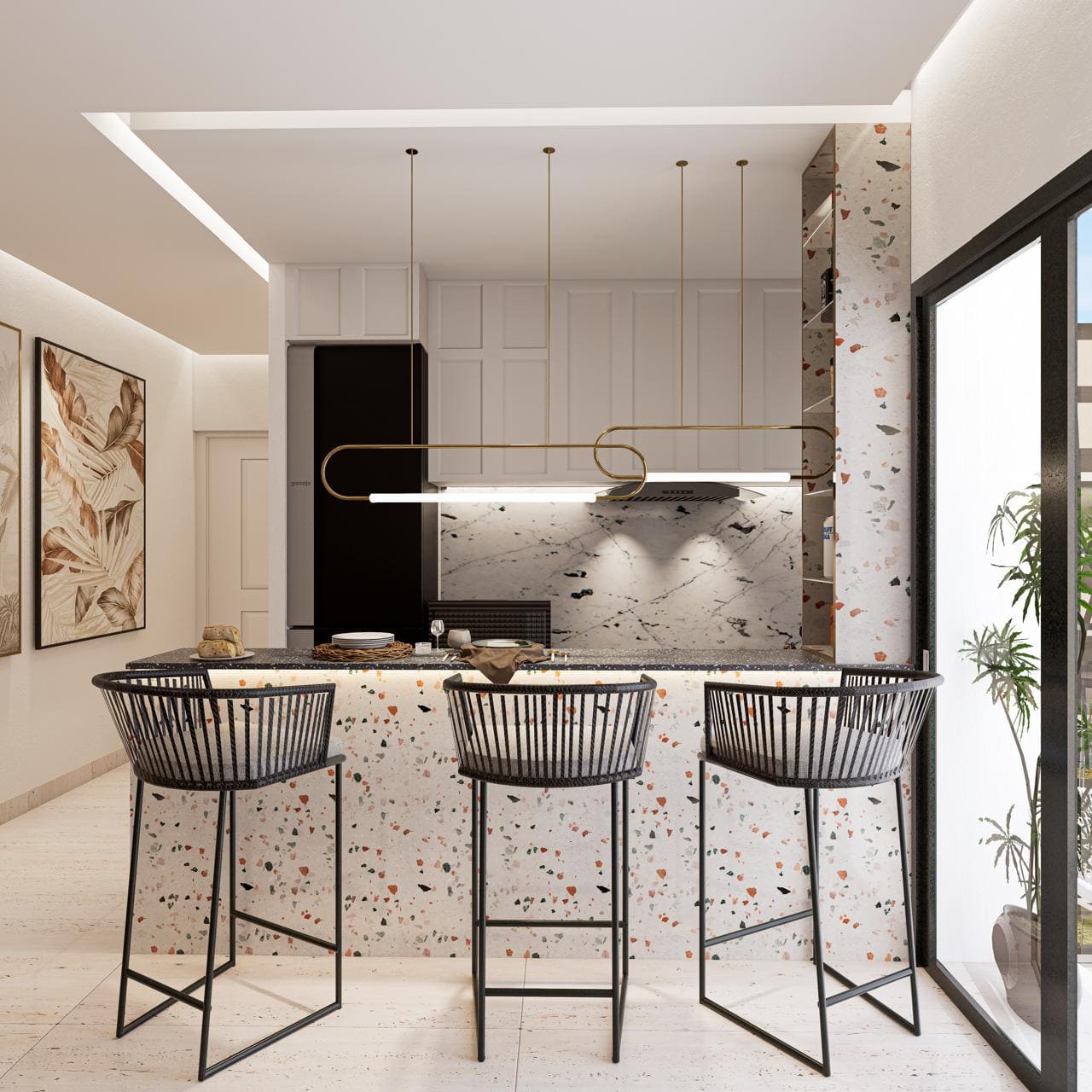 The dining area blends seamlessly with the living space, featuring custom display cabinetry, glass shutters, and warm lighting. A designer chandelier and well-planned storage elevate the dining experience while maintaining visual continuity throughout the home.