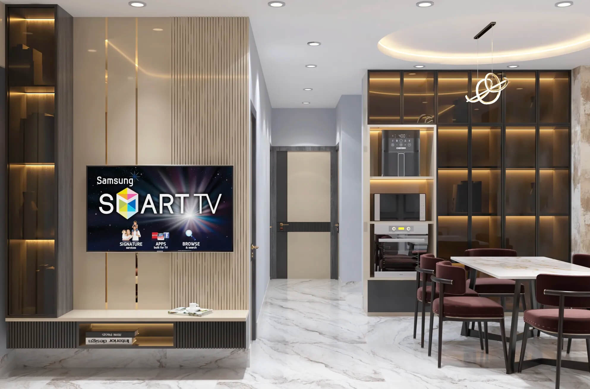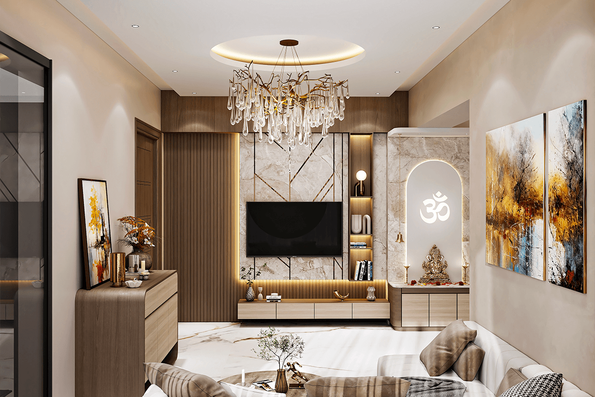 The living room is designed to be both inviting and visually striking, featuring a custom TV unit, integrated display niches, and ambient lighting. Subtle décor elements and balanced proportions create a refined yet comfortable atmosphere for everyday living and entertaining.