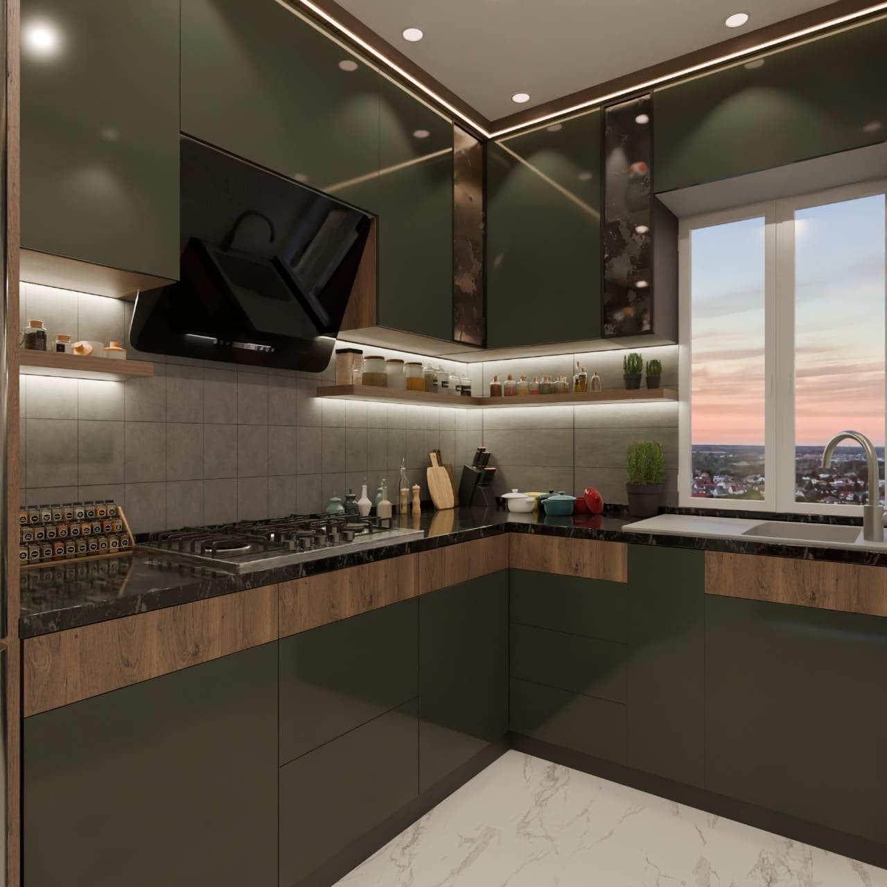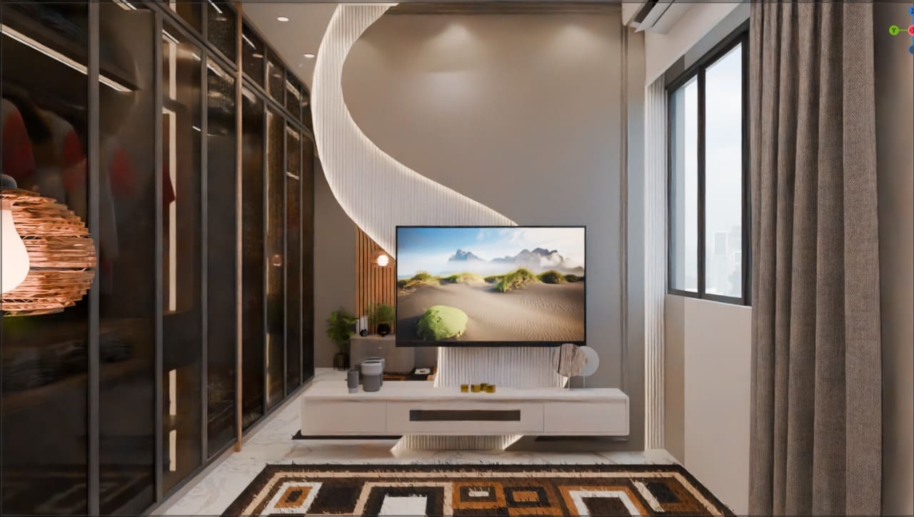 The living space is highlighted by a sleek TV unit with vertical panel detailing and ambient LED lighting, giving the room a sophisticated focal point. Display cabinets with soft backlighting enhance depth and visual interest, while neutral tones keep the space calm and welcoming.