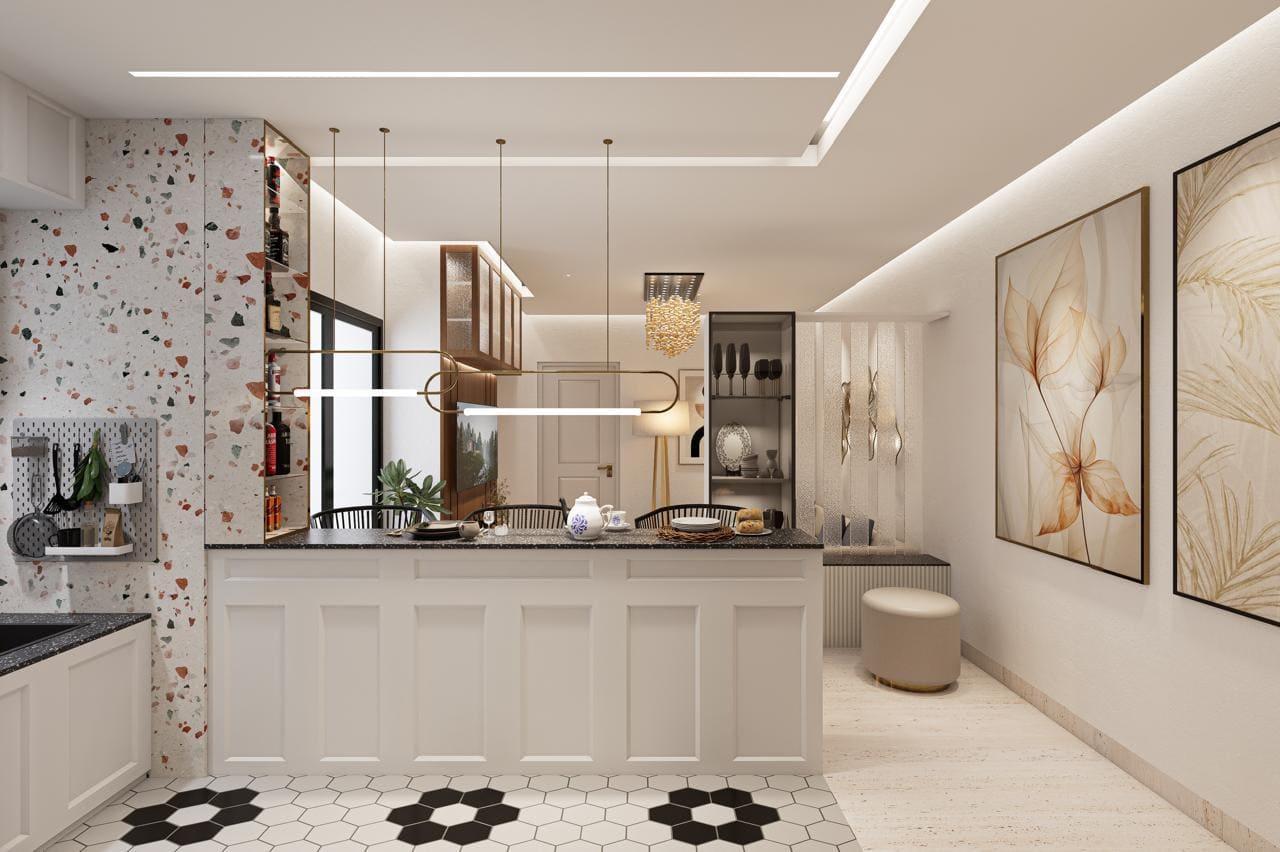 The dining area blends seamlessly with the living space, featuring custom display cabinetry, glass shutters, and warm lighting. A designer chandelier and well-planned storage elevate the dining experience while maintaining visual continuity throughout the home.