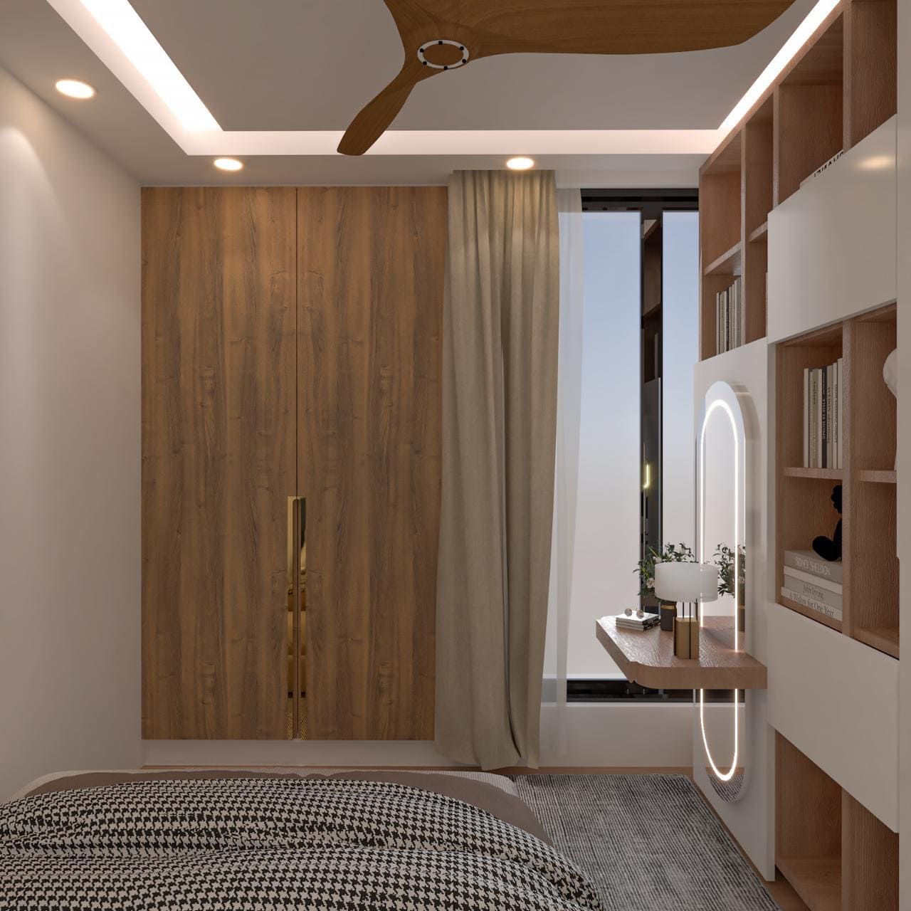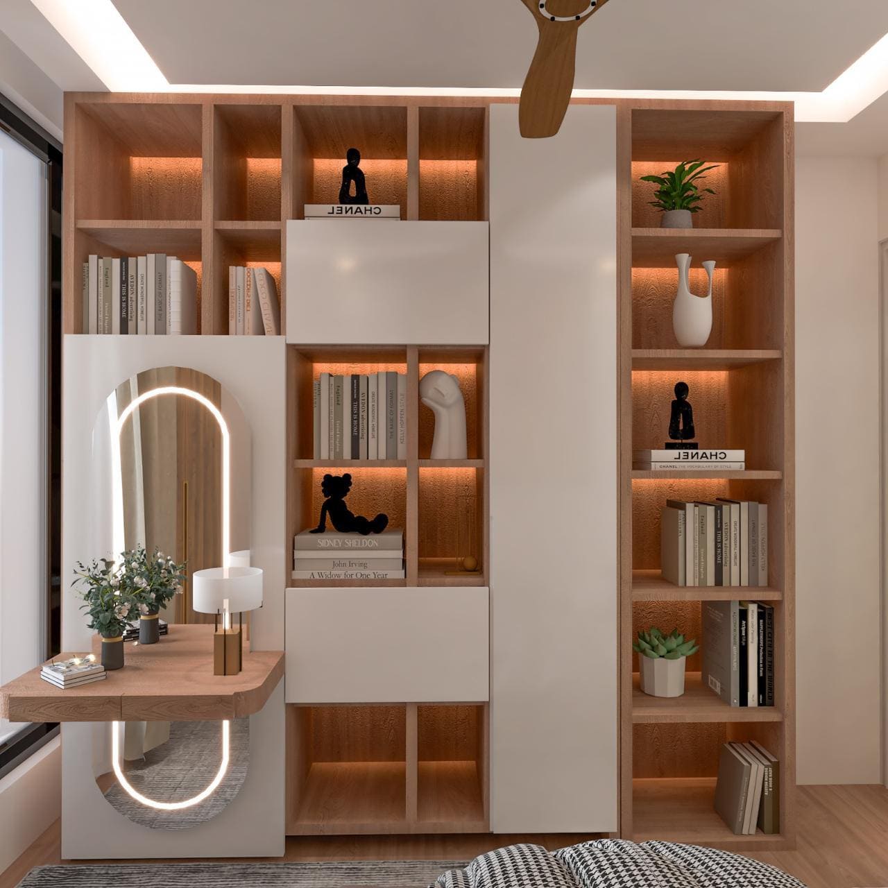 The living space is highlighted by a sleek TV unit with vertical panel detailing and ambient LED lighting, giving the room a sophisticated focal point. Display cabinets with soft backlighting enhance depth and visual interest, while neutral tones keep the space calm and welcoming.